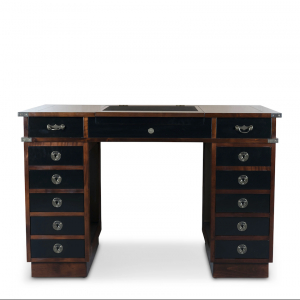 Das Design erinnert an die Kolonialzeit in Indien. Die Oberfläche wurde in edler French-Finish-Optik gehalten. Solides Messing, welches in antikfinish gebürstet ist, schützt die Kanten und wurde für die Beschläge verwendet. Die Schreibtischplatte lässt sich mittig aufklappen. Dort kann mühelos ein Laptop deponiert werden. Rechts und links davon jeweils eine Schublade. In den darunterliegenden Seitenteilen befinden sich jeweils fünf weitere Schubladen. Der gesamte Schreibtisch besteht aus drei Teilen. Jedes einzelne Teil kann ganz problemlos durch seine seitlichen Messinggriffe transportiert werden.