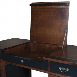 Zur Kolonialzeit wurde dieser wundervolle Schreibtisch als Reiseutensil verwendet. Für die Fertigung werden auch heute noch auserlesene Kirsch- und Ahornhölzer verwendet. Traditionell abgelagert und getrocknet bildet das Holz die Grundlage für einen soliden und stabilen Reiseschreibtisch, welcher die damaligen Strapazen der ständigen Reisen über See und Land überstehen mußte. Auch heute noch wird dieser Schreibtisch in althergebrachter Handwerkskunst gefertigt. Die qualitativ sehr hochwertigen Materialien und deren Verarbeitung machen dieses Möbelstück zu einem sehr langlebigen Designerstück.